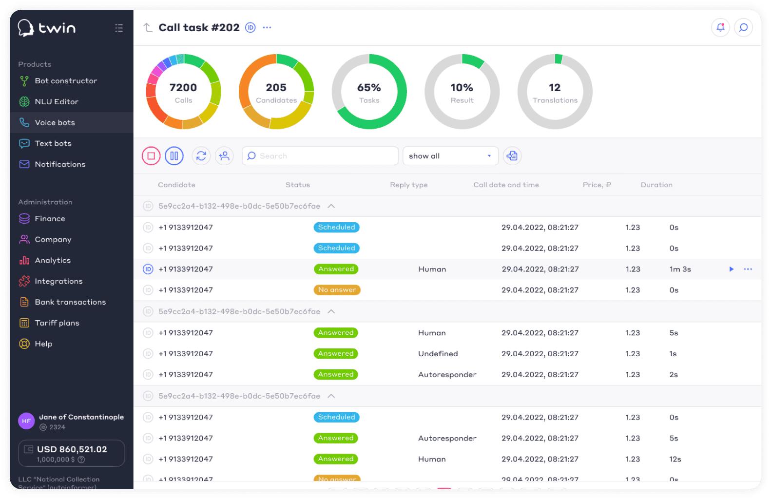 Next-generation chat assistants include detailed work analytics. Upload chat and transaction history, communication results as a file or integrate directly with CRM.